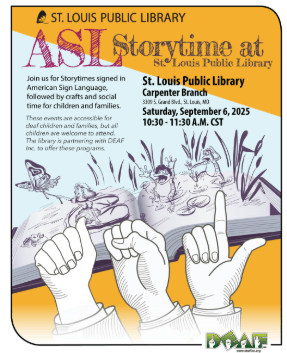 A storytime signed in American Sign Language, followed by crafts and social time for children and families. This event is accessible for deaf children and families but all children are welcome to attend. The library is partnering with DEAF, Inc. to offer this program. Ideal for ages 8 and under. Sensory Considerations: Potential for close proximity/shared space with other participants Some bright colors and loud noises. For accessibility accommodations, please call 314-241-2288.