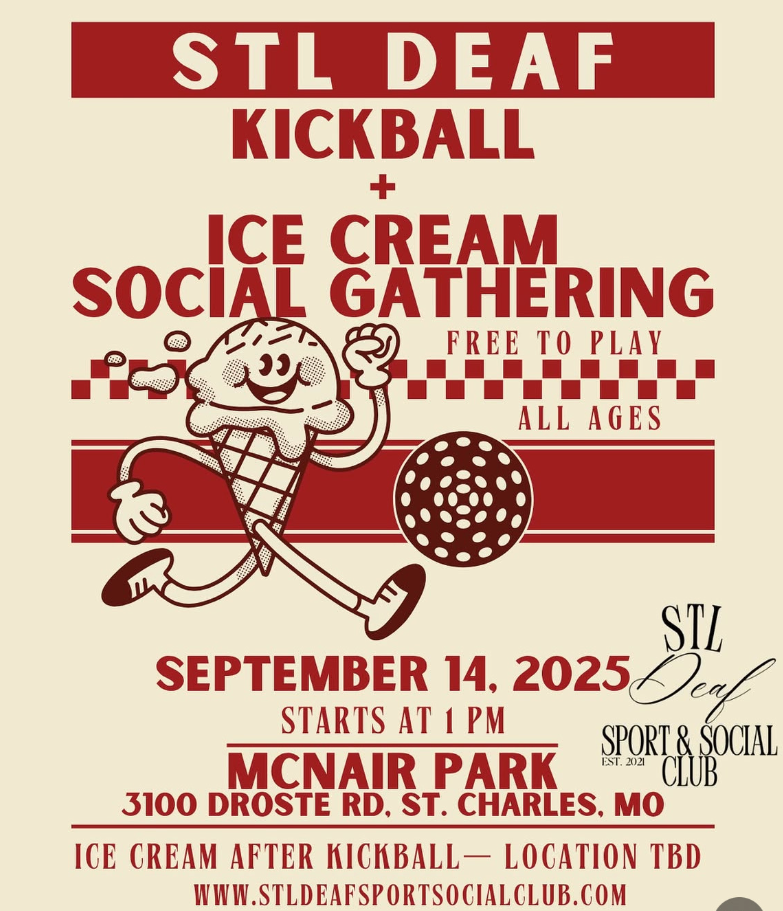 Bring your energy for a fun kickball game at McNair Park. After the game, we’ll head to a nearby spot for ice cream (location will be decided that day). 🍦🤗 When: September 14, 2025 | Starts at 1 PM Where: McNair Park | 3100 Droste Rd, St. Charles, MO 63301 Free | Ice cream after the game (buy your own!) | All Ages Follow us on Instagram @stldeafsportsocialclub to stay in the loop about future events! STL Deaf Sport & Social Club is a FREE community event open to everyone in the Deaf/HoH and Hearing communities – Deaf, Hard of Hearing, family members, friends, interpreters, and ASL students are all welcome!